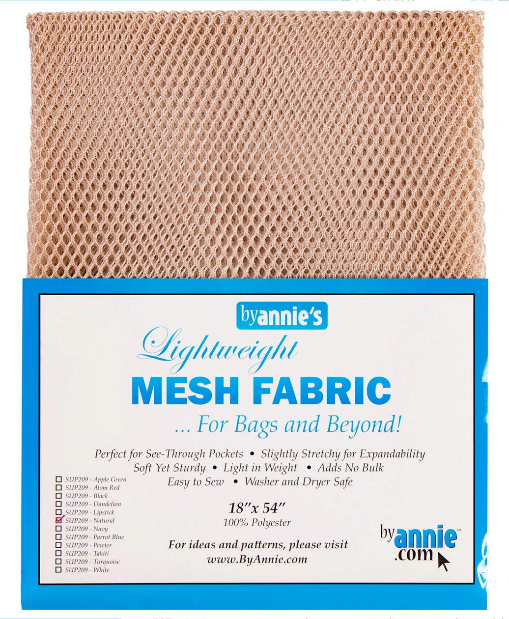 Lightweight and a bit stretchy, this mesh is fabulous! Perfect for pockets on bags or anywhere you want to be able to see what you are storing, the mesh also works great in various garment applications and utility needs. To help you sew, the mesh is specially coated to be less slippery and easy to work with, while still being soft and pliable. Finish the edges with a simple binding using your favorite fabric or try our extra-easy-to-use fold-over elastic to provide extra stretch. 100% polyester. Washer and dryer safe. May be pressed on medium heat.