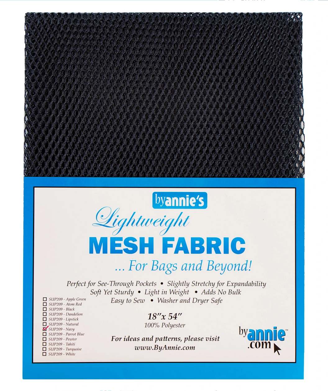 Lightweight and a bit stretchy, this mesh is fabulous! Perfect for pockets on bags or anywhere you want to be able to see what you are storing, the mesh also works great in various garment applications and utility needs. To help you sew, the mesh is specially coated to be less slippery and easy to work with, while still being soft and pliable. Finish the edges with a simple binding using your favorite fabric or try our extra-easy-to-use fold-over elastic to provide extra stretch. 100% polyester. Washer and dryer safe. May be pressed on medium heat.
