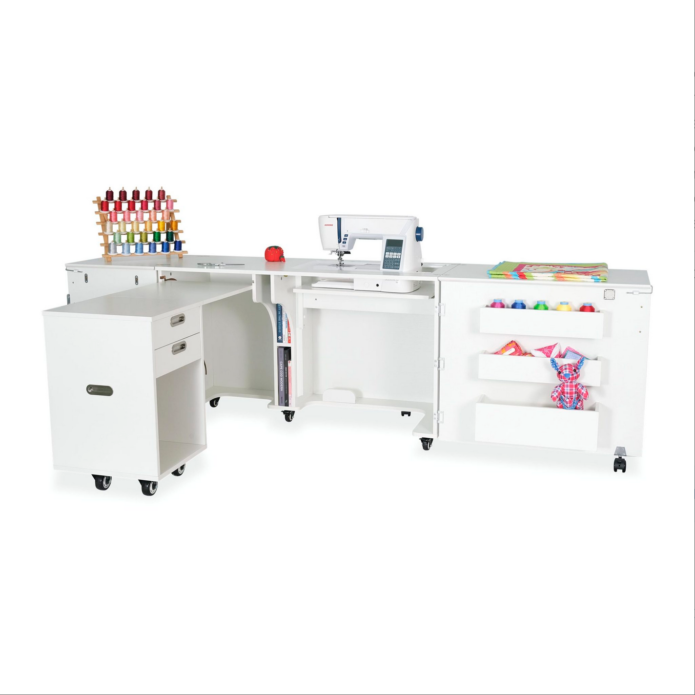 Welcome to your dream sewing studio! Aussie Sewing Cabinet is a signature, full-size sewing cabinet from Kangaroo Sewing Furniture highlighted by over 31 square feet of sewing worksurface and a 3 position hydraulic sewing lift for free arm and flat bed sewing! Aussie features a rolling storage caddy, perfect for storing a serger or other sewing notions, that moves to multiple preset configurations for a customizable workstation. Your large quilting projects will be thanking you in no time! It’s hard to believe, but Aussie collapses to just over 4′ x 2′ for home-friendly storage… small footprint, big possibilities!