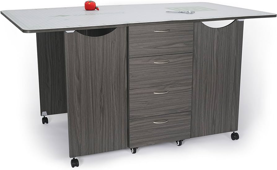 Kangaroo’s premiere cutting table is the perfect addition to your sewing and crafting studio! Kookaburra’s timeless design and elegant fixtures provide storage, convenience and function – along with an expansive 70″ x 40″ worksurface! Kookaburra sits on 8 heavy-duty casters to provide stability, easy mobility and 360° access. Even better – Kookaburra’s 2 side leaves fold down to 20″ x 40″ to easily store when not in use! 4 storage drawers on the front, 4 storage shelves on the back, and 1 beautiful cutting table to help elevate your sewing and crafting experience!