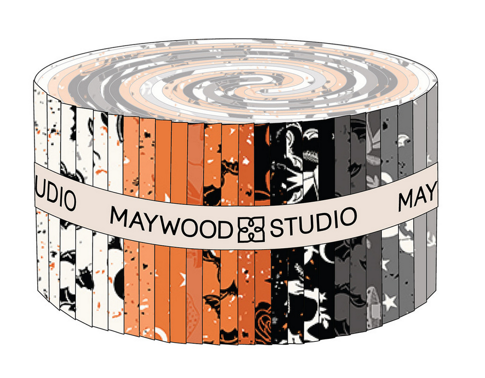 Join us at Goth Gardens for frightful festivities! You will be greeted by smiling skulls, jack-o-lanterns, haunted roses, and creepy crawlies as you wander through the moonlit garden. Flecked blenders in orange, black, and white add background texture and interest. With large, medium, and small-scale prints that pair perfectly together, Goth Gardens will make you shiver with anticipation.