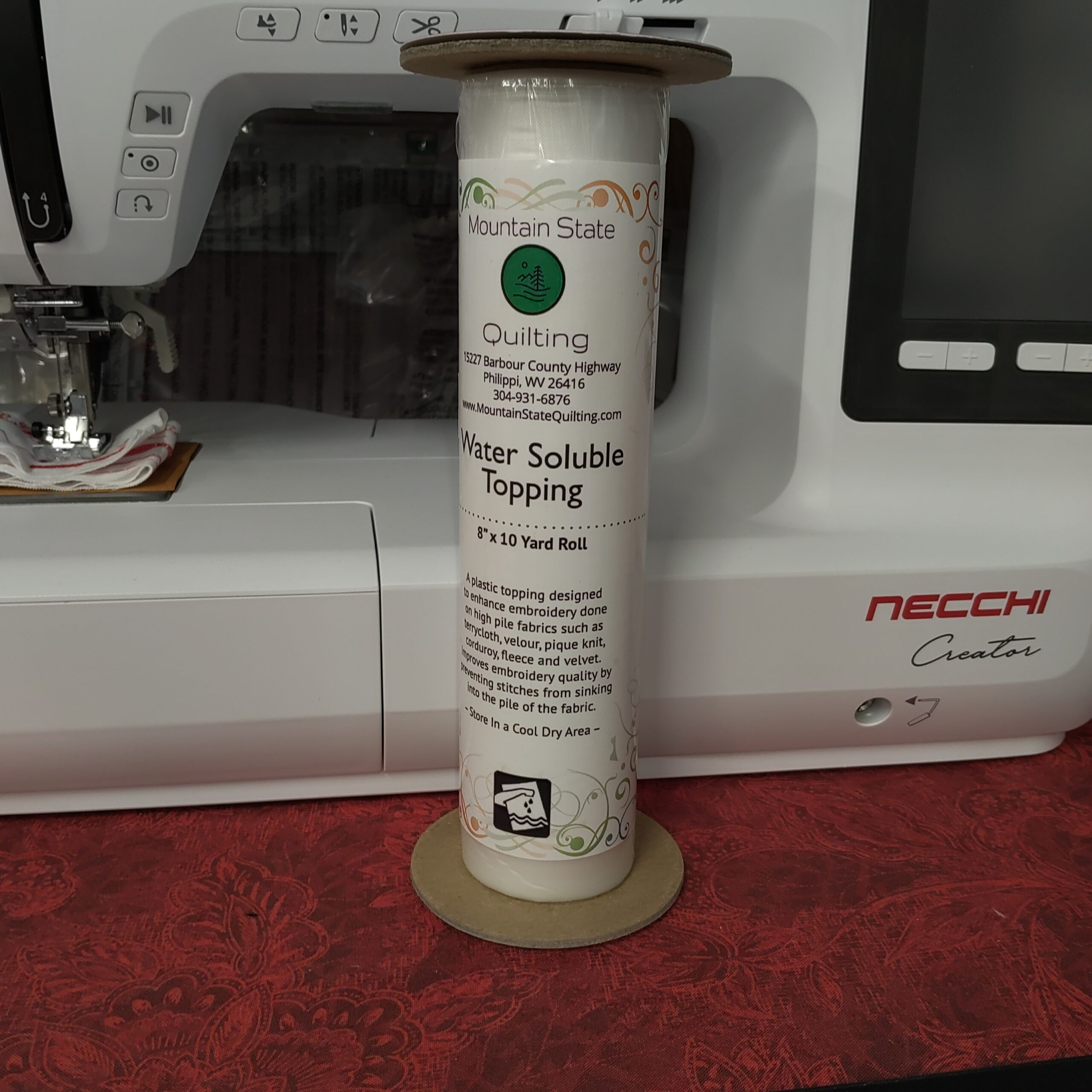 Plastic topping used on the top side of fabrics such as terrycloth, velour, loosely knit pique, sweaters, corduroy, and fleece. Improves embroidery quality by preventing stitches from sinking into the pile of the fabric.