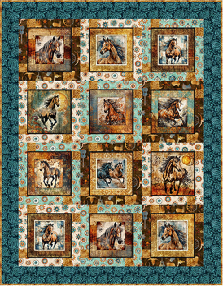 Capture the untamed spirit and beauty of wild animals! Horses and bulls combine with iconic farm motifs, geometric medallions, and paisleys in picture patches, a border stripe and allovers rendered in a rustic, earthy color palette. ©Dan Morris