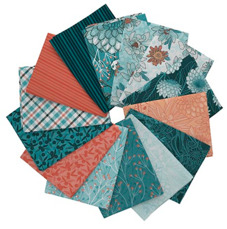 Dahlias are nothing short of dazzling in this contemporary and stylish collection. Bouquets of stylized florals in rich teals infused with salmon pink pair with delicate flora, tonal, checks and stripes. Create one-of-a-kind quilts, fashionable home décor, accessories, and apparel. Project possibilities are endless! Contains 14 fat quarters ©Julie Lynch