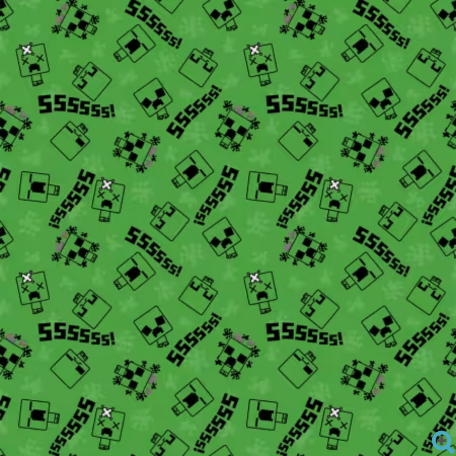 This vibrant fabric features a playful design inspired by the popular Minecraft game, showcasing various chibi-style Creepers in different poses against a bright green background. The pattern includes iconic elements like the Creeper face, the characteristic "SSSS" sound, and other game-related symbols, all rendered in a pixelated style that fans will instantly recognize. Perfect for crafting projects that appeal to gamers and kids alike, this fabric brings a fun and interactive element to any creation.
