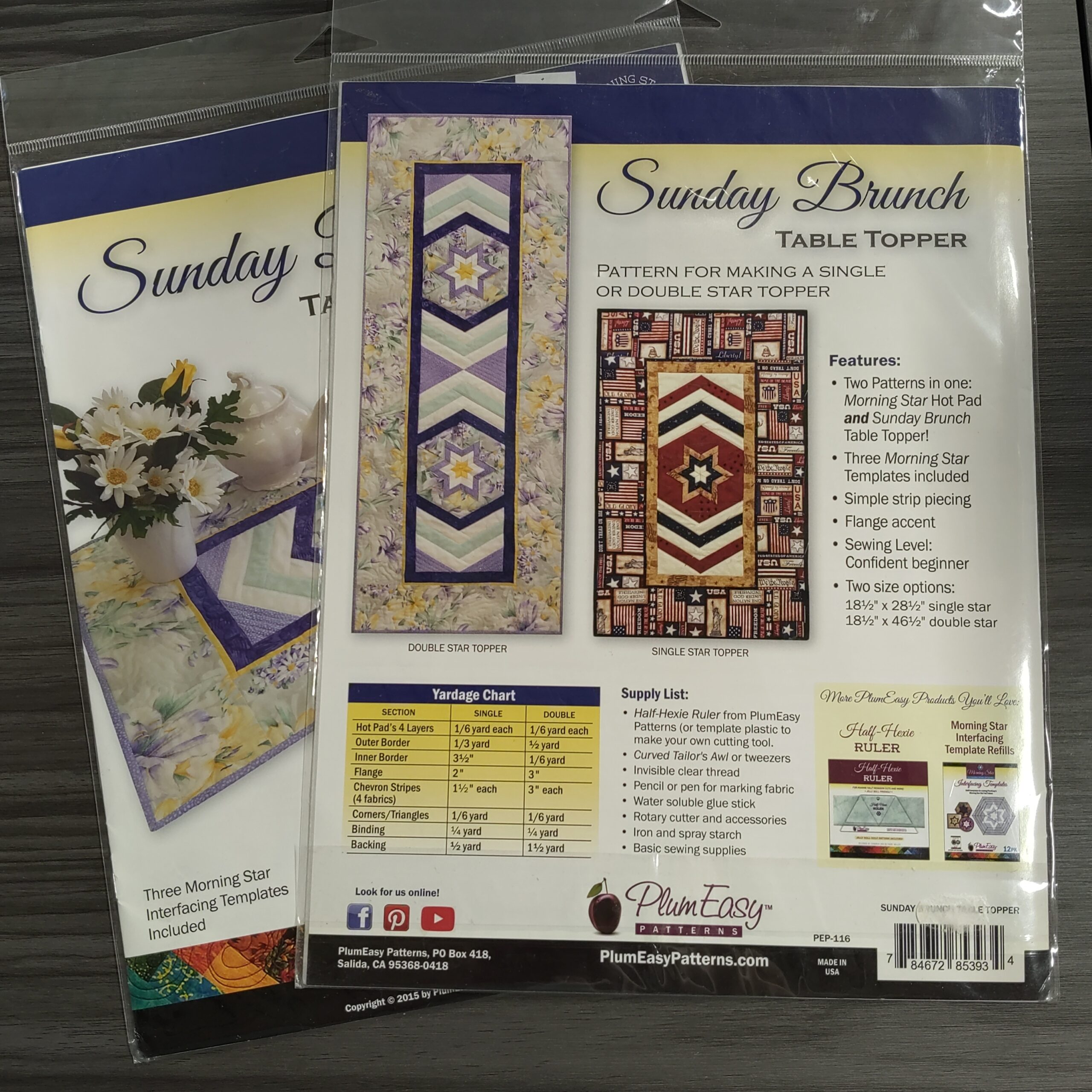 2 patterns in one Morning Star Hot Pad and Sunday Brunch Tabl Topper. 3 morningstar templates included. Simple strip piecing. Skill level confident beginner