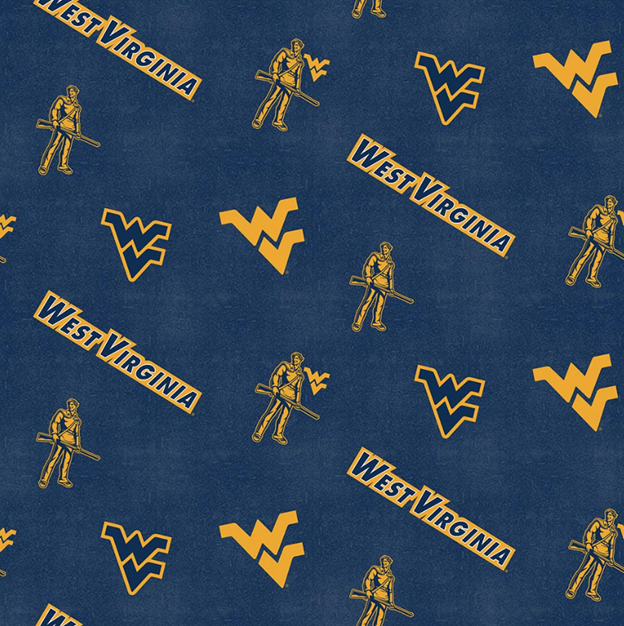 This vibrant fabric features a striking design with the West Virginia logo and mascot prominently displayed in a repeating pattern. The background is a deep navy blue, providing a bold contrast to the bright yellow-gold elements of the design, including the iconic "WV" logo and the state's name in a distressed font. The fabric is ideal for creating apparel or accessories that showcase school spirit or regional pride, while its soft flannel texture ensures comfort and warmth.