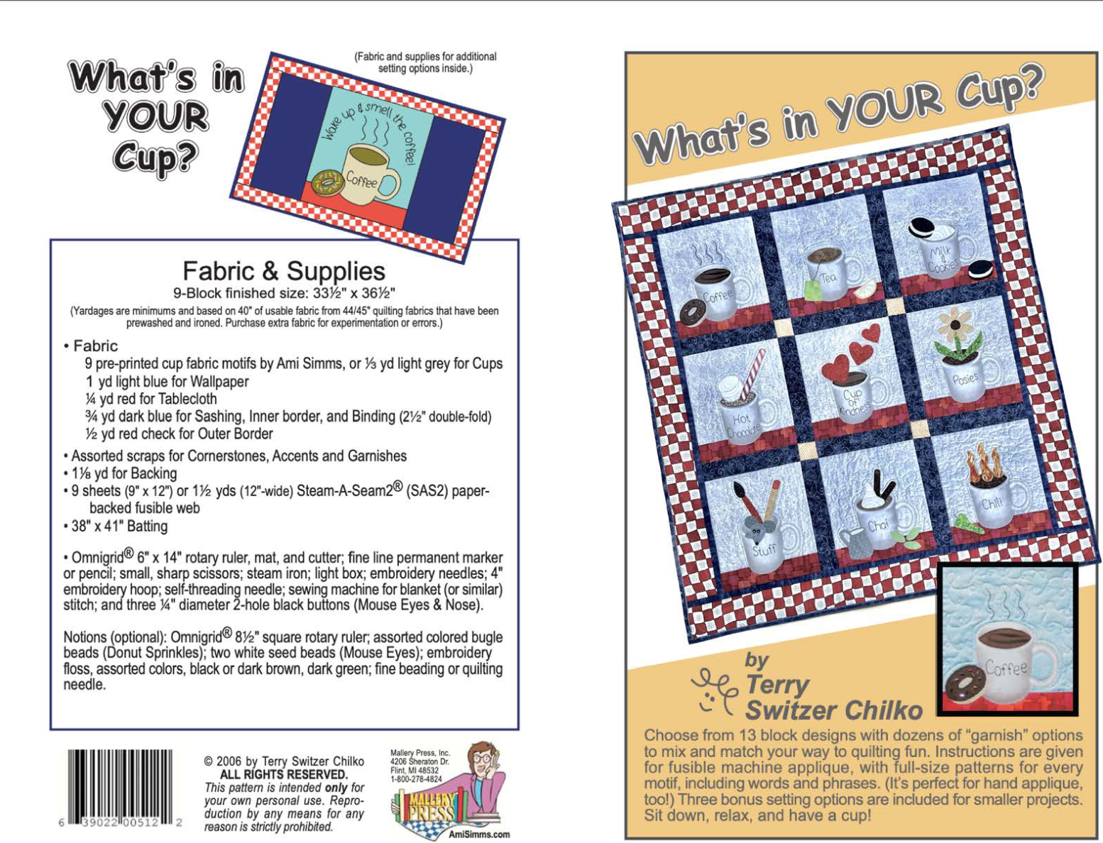 Included are additional settings for 1-block placemat/wallhanging, 4-block wall hanging and 3-block wall or tablerunner. 4 bonus cups are included, not shown in cover quilt.